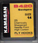Dark bronze in color, sedge style special loop bend hook, chemically sharpened, angle-up eye. High carbon needle point. Model #B420, listed in sizes 8-16. Available in 25 or 100 hooks per package.